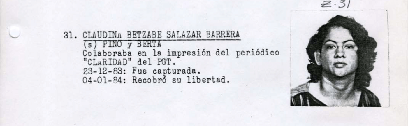 21. Claudina Betzabe Salazar Barrera: Señalada de colaborar en la impresión del periódico “Claridad” del PGT. Fue detenida el 23 de diciembre de 1983 y liberada 11 días después.