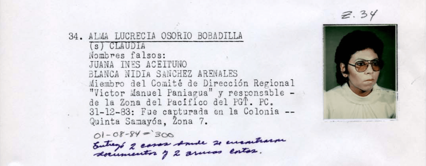 19. Alma Lucrecia Osorio Bobadilla: Señalada de ser miembro del Comité de Dirección Regional “Víctor Manuel Paniagua” y responsable de la zona del pacífico del PGT. Detenida en la Colonia Samayoa, zona 7 de la capital.