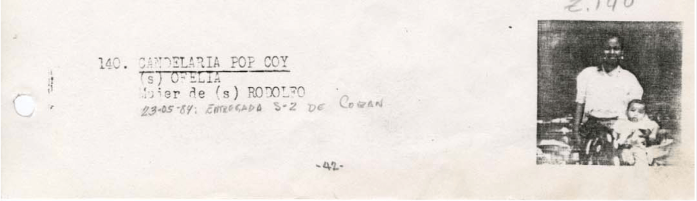 4. Candelaria Pop Coy: Solo se registra que fue la mujer de Rodolfo. Fue detenida el 23 de mayo de 1984.