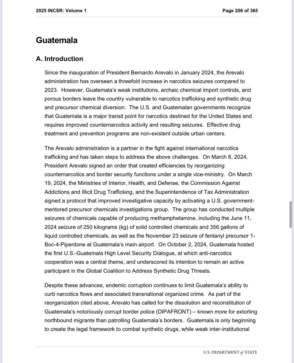 “Desde la toma de posesión del presidente Bernardo Arévalo en enero de 2024, su administración ha supervisado un aumento triple en las incautaciones de droga en comparación con 2023. Sin embargo, las débiles instituciones de Guatemala, sus obsoletos controles de importación de químicos y sus fronteras poderosas dejan al país vulnerable al tráfico de drogas y al desvío de sustancias sintéticas y precursores químicos”, señala el primer informe de 2025.