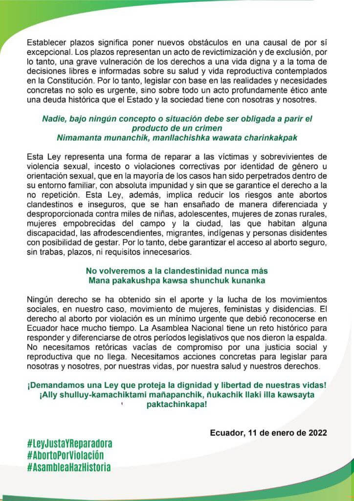 Las organizaciones feministas tenían expectativa de que, después de las sesiones en la Comisión, el debate llegue al pleno en diciembre; pero, la Asamblea cerró el año con este pendiente. Ya para fines de diciembre la Comisión dio a conocer un calendario para el tratamiento de la Ley en 2022, donde disponía que la Comisión retomaría la sesión el 5 de enero y el segundo debate en el pleno sería el 11 de enero; pero, de nuevo, esta agenda se modificó.