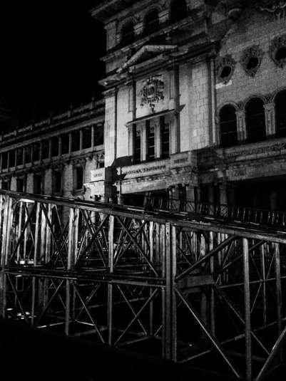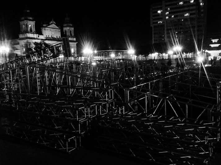 A las 6 de la tarde, la gente que no ha parado de asistir al parque central se topó con la sorpresa, varios trabajadores comenzaron a armar varias estructuras de metal, sobre la calle colocaron equipo pesado, plantas de energía como para iluminar un estadio de futbol, tarimas, cajas metálicas, etc.