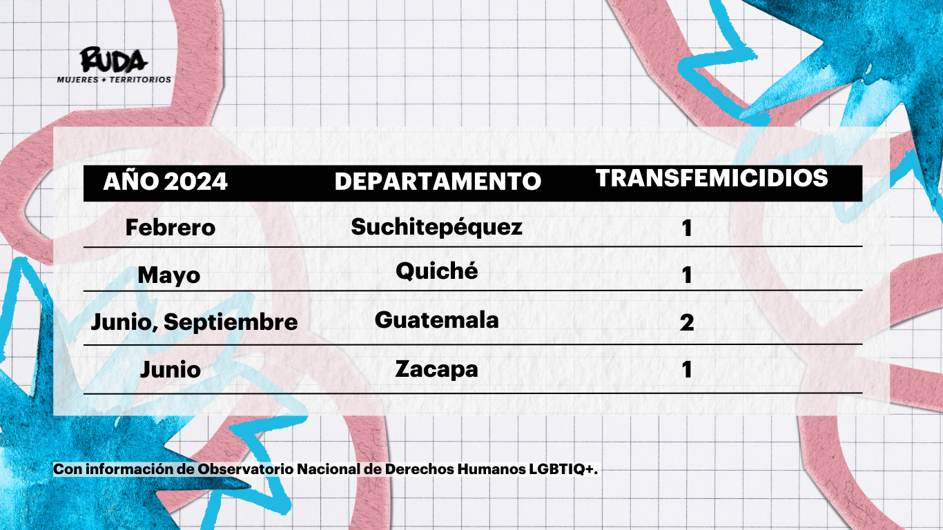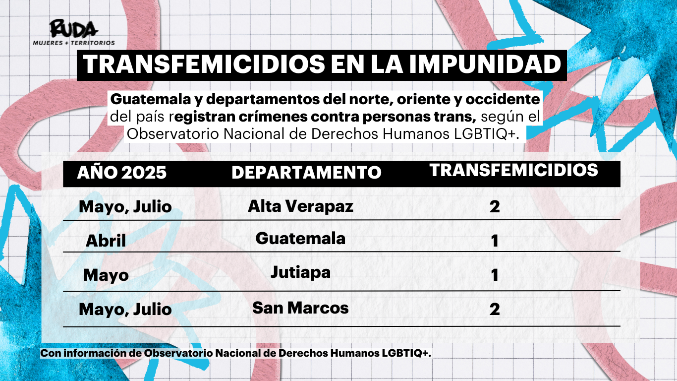 En lo que va del 2025 se registran transfemicidios en los departamentos de San Marcos, Alta Verapaz, Jutiapa y Guatemala, de acuerdo al Observatorio Nacional de Derechos Humanos LGBTIQ+. Mientras en el 2024, la violencia contra la comunidad trans se consignó en los departamentos de Guatemala, Zacapa, Quiché y Suchitepéquez.