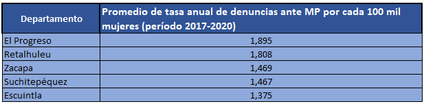 En el departamento de Guatemala la tasa de denuncias de violencia contra las mujeres en promedio anual, considerando el período 2017-2020 ha sido de 912 denuncias por cada 100 mil mujeres, y a nivel nacional este dato es de 947. Esto indica que en los últimos 4 años, por cada 100mil mujeres en el país se han registrado en el MP 947 denuncias por violencia en contra de la mujer.