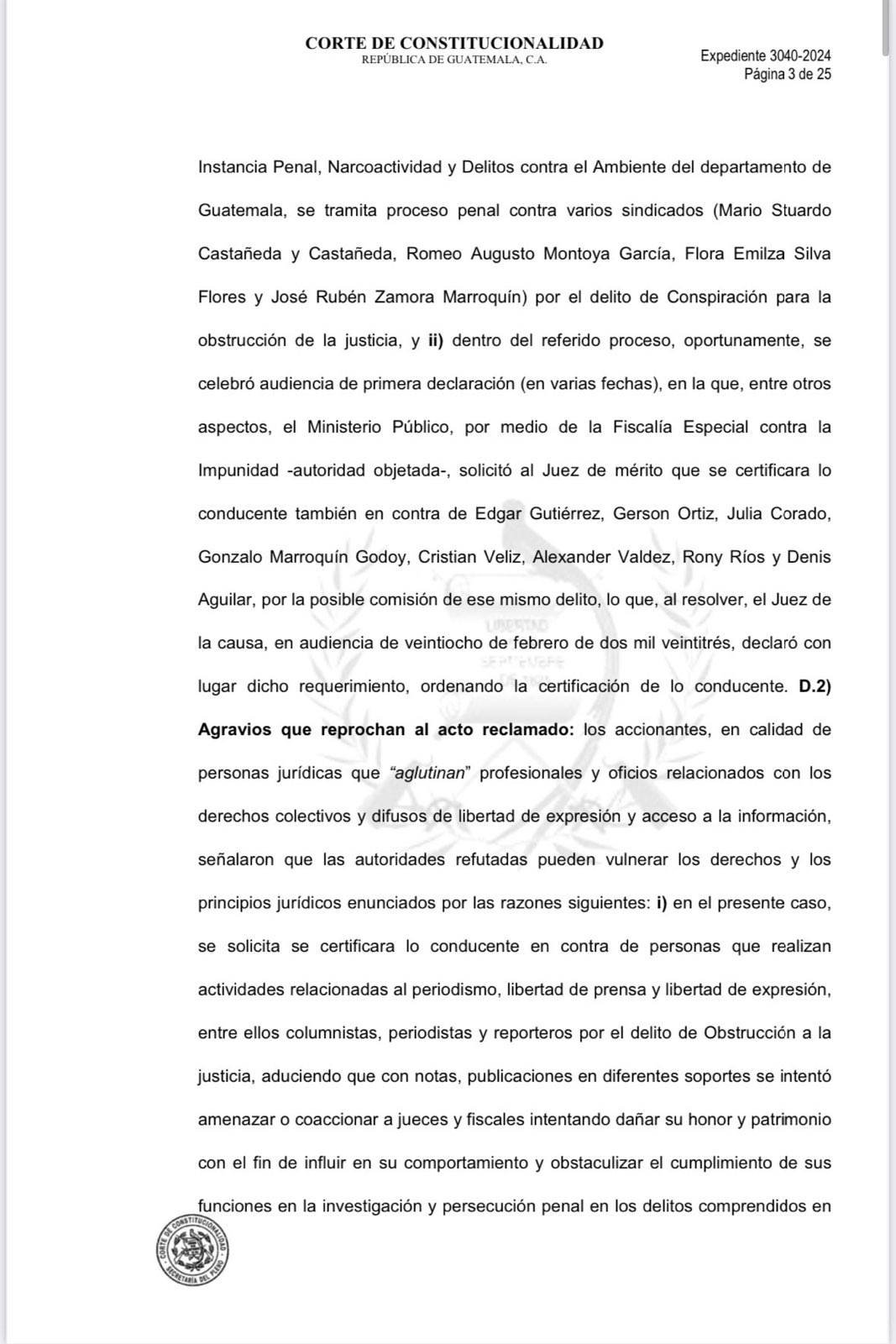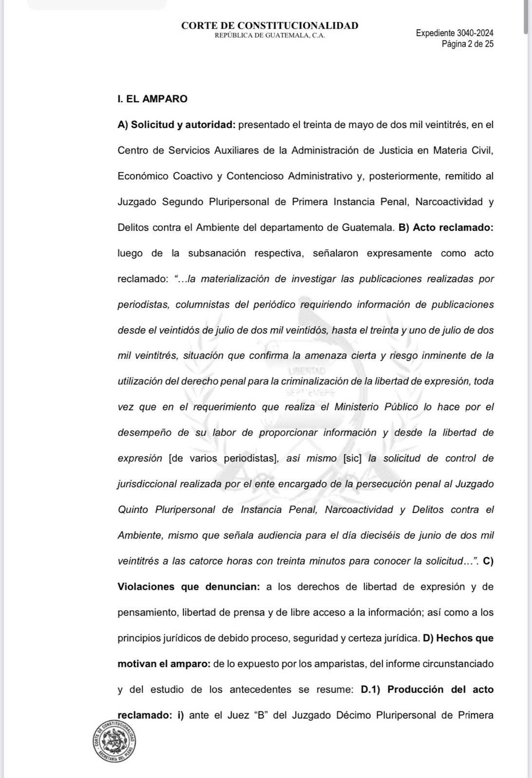 El recurso legal fue solicitado por la Cámara de Locutores Profesionales de Guatemala, la Asociación Cronistas Deportivos, Asociación de Periodistas de Guatemala, Federación Guatemalteca de Escuelas Radiofónicas (FGER), el gremio de periodistas de Guatemala e integrantes del colectivo Red Rompe el Miedo Guatemala, contra el fiscal Rafael Curruchiche y la fiscal regional del metropolitana, Silvia Janeth García Guzmán.