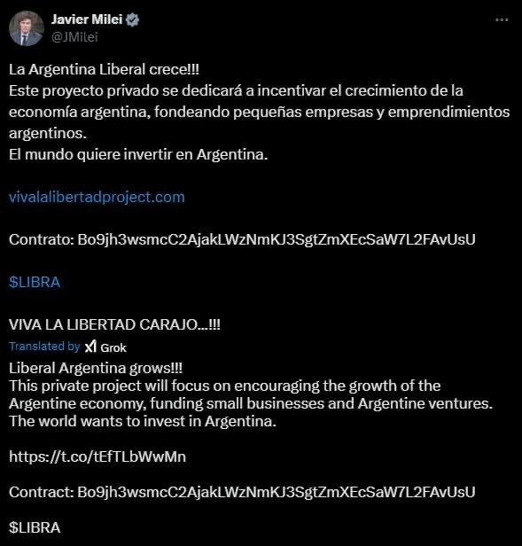 En su publicación, Milei afirmó: “¡La Argentina Liberal crece! Este proyecto privado se dedicará a incentivar el crecimiento de la economía argentina, fondeando pequeñas empresas y emprendimientos argentinos. El mundo quiere invertir en Argentina”. Acompañó su mensaje con un enlace al sitio Viva La Libertad Project, de la empresa KIP Protocol, y mantuvo fijado el posteo durante más de cinco horas.