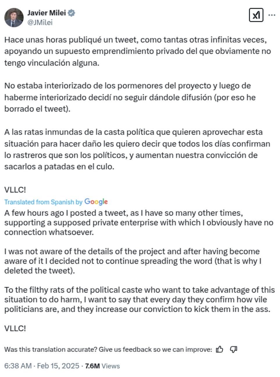 Cuando el fraude se hizo evidente, muchos pensaron que la cuenta del presidente había sido hackeada. Pero no: Milei admitió haber escrito el tuit. "No estaba interiorizado de los pormenores del proyecto y, luego de haberme informado, decidí no seguir dándole difusión (por eso borré el tuit)", intentó justificarse en un segundo posteo.