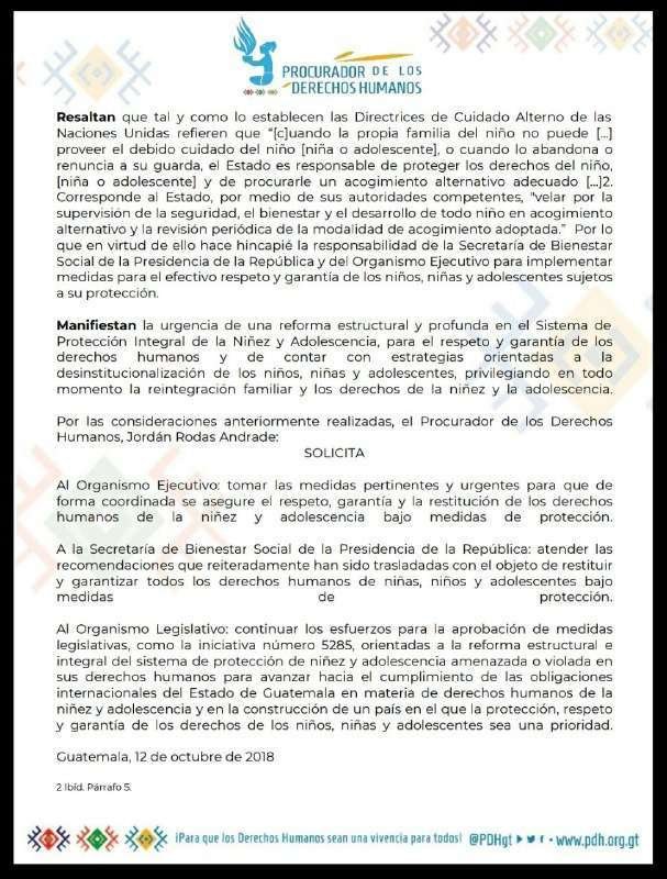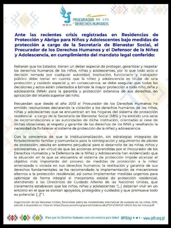 En noviembre recién pasado, en una visita no oficial del Comité de los Derechos del Niño, representado por Jorge Cardona y Luis Pedernera, analizaron la situación de la niñez guatemalteca y los mecanismos de seguimiento a las observaciones finales y recomendaciones hechas por ellos, dijeron que los menores en conflicto con la ley penal se encuentran en mejores condiciones que los niños, niñas y adolescentes (NNA) en protección del Estado de Guatemala.