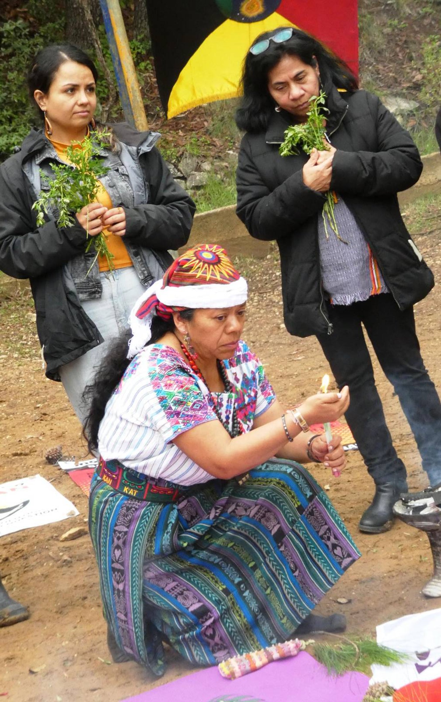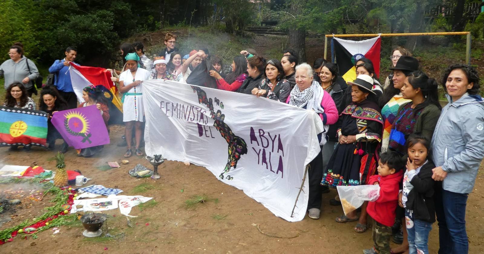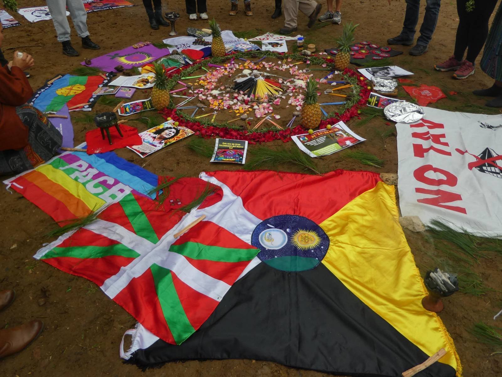 La invocación a cada uno de los 20 nawales fue utilizado para ir desgranando historias, luchas, y complicidades, para ir dotando de sentido y de vida a las banderas maya, vasca, kurda, mapuche, del Tahuantinsuyu, del movimiento italiano NoTAV, del EZLN y de la diversidad sexual, , que rodeaban el fuego; para recordar a la líder lenca Berta Cáceres, al activista nahuatl Samir Flores, Nora, al luchador k’iche’ Aníbal Cuadra, la niña paraguaya Lichita, las madres argentinas Norita Cortiñas y Pato Delpino, a los presos tzeltales de Cancuc y José Díaz Gómez, chol. Todas ellas y ellos formaron parte de la comunidad que se creó alrededor de ese fuego en que Lolita nos compartió sus luchas y sus recorreres, sus miedos y sus amistades.