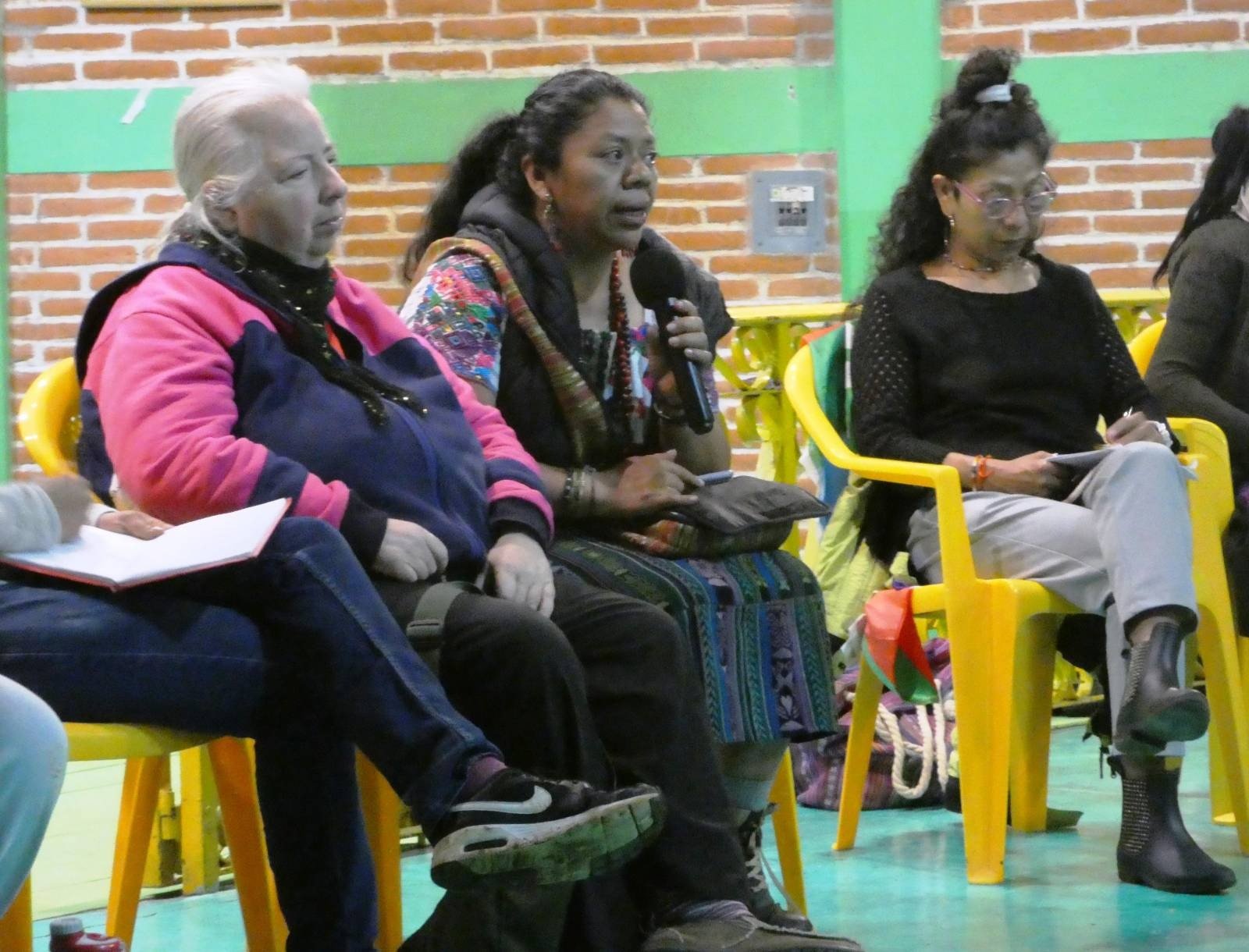 Después de la ceremonia, pasamos al salón de actos del CIDECI, donde tantas cosas han pasado y se han decidido en las últimas décadas. Con un cafecito en las manos y sentados en círculo, fuimos escuchando historias y propuestas. Adriana Guzmán y Claudia Korol nos hablaron las Feministas de Abya Yala, el grupo que conforman junto con Lolita y otras mujeres, que son quienes prepararon este “retorno comunitario”. Nos explicaron que es un acto político para mostrar la resistencia de los pueblos como un tejido colectivo, como ese tejido que Lolita ha ido confeccionando en estos años.