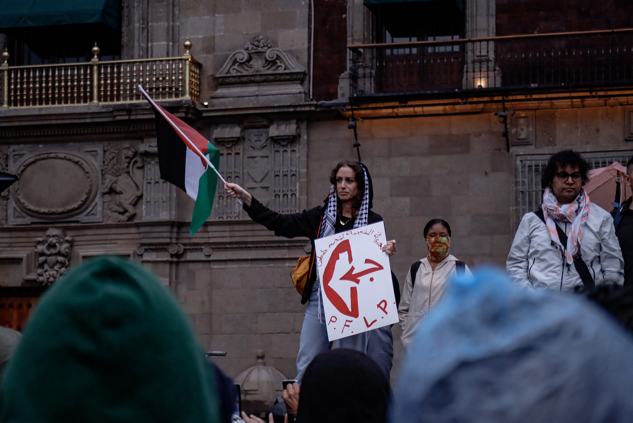 Al llegar a Palacio Nacional, desde donde despacha la presidenta Claudia Sheinbaum, lxs manifestantes realizaron un mitin y exigieron que México rompa relaciones con Israel, y condenaron los recientes ataques de Israel contra Irán.