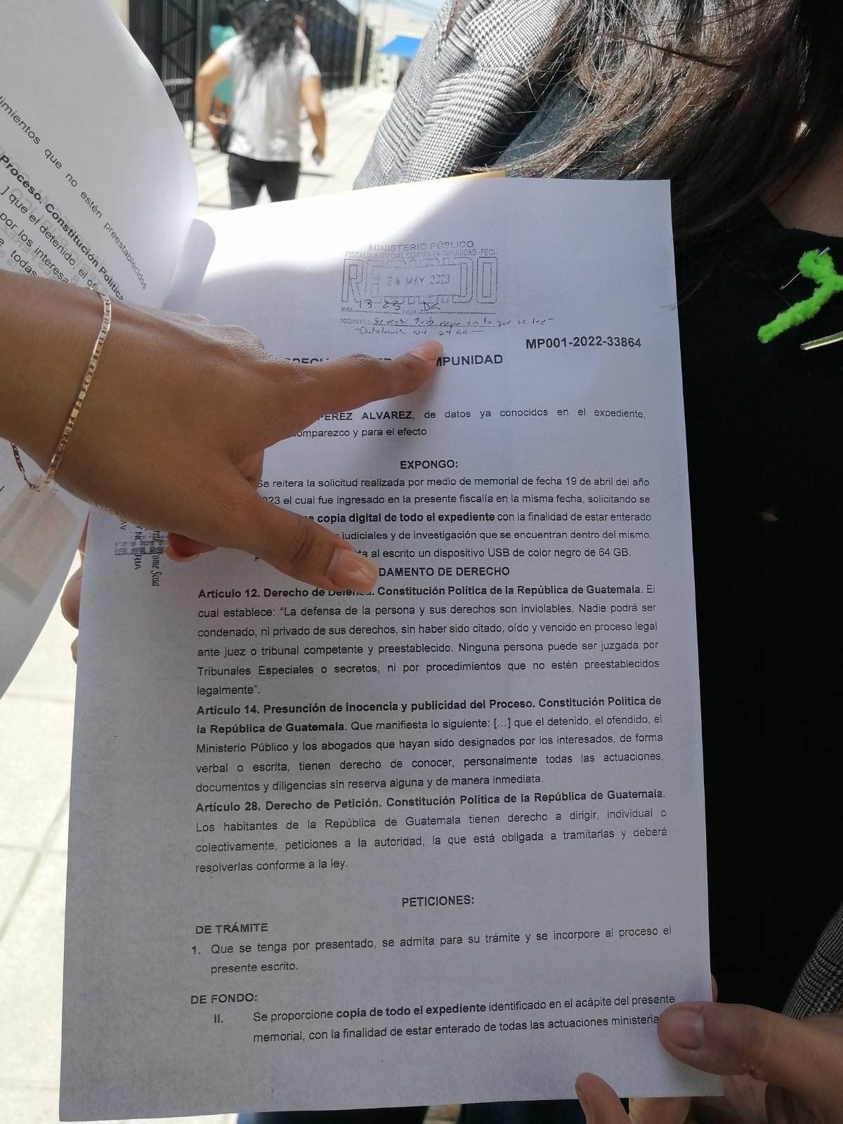 El reloj marcó las once cuarenta y cinco, y las abogadas seguían en espera. Después de dos horas, al mediodía un oficial de la FECI, salió de entre las puertas corredizas de vidrio a recibir el memorial. Conversaron durante algunos minutos: “Son varios memoriales los que hemos ingresado solicitando la misma petición de entrega del expediente y no nos han resuelto, ni por vía telefónica. Jamás toman mis recados ni tenemos respuesta, ¿Qué hacemos?”, cuestionó Joseline Jácome.