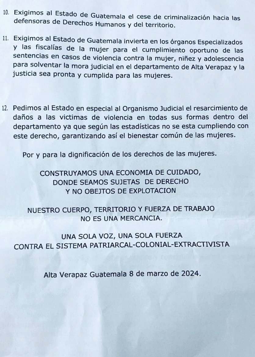 En este comunicado las mujeres organizadas también exigieron el fortalecimiento al sector laboral por parte del Estado, educación integral para la niñez y la juventud priorizando a las mujeres, atención integral con pertinencia cultural en las oficinas municipales de la mujer y mayor presupuesto para la atención de sus demandas, entre otras.