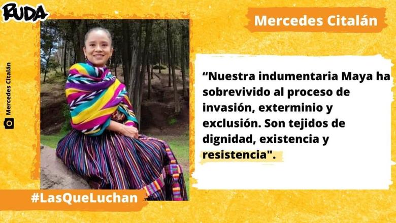 Así mismo, Mercedes expresa: “En mi caso, lo que yo podría decir es que llevo varios años ya accionando en la defensa de los derechos de los pueblos indígenas y de las mujeres. Un espíritu de resistencia, desafiando al estado y su sociedad racista portando mi indumentaria indígena en los diferentes espacios que me desenvuelvo, sociales, políticos, económicos. En el sentido del colectivo, es visibilizar que existe la propiedad intelectual de nuestros tejidos tradicionales y conocimientos ancestrales, para evitar el saqueo que están sufriendo los pueblos indígenas por parte de los sectores mercantilistas de poder que usan nuestros elementos de nuestra indumentaria maya con fines de explotación de mercadeo y de lucro”.