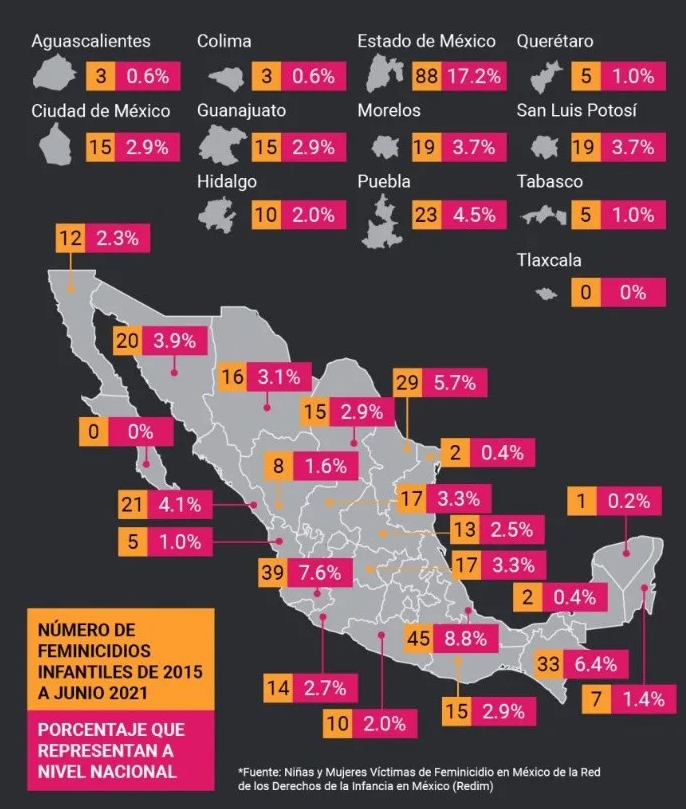 De acuerdo con la plataforma Niñas y Mujeres Víctimas de Feminicidio en México construida por la Red por los Derechos de la Infancia (Redim) con base en cifras del Secretariado Ejecutivo del Sistema Nacional de Seguridad Pública (SESNSP), de 2015 a junio de 2021 en México se han cometido 512 feminicidios infantiles.