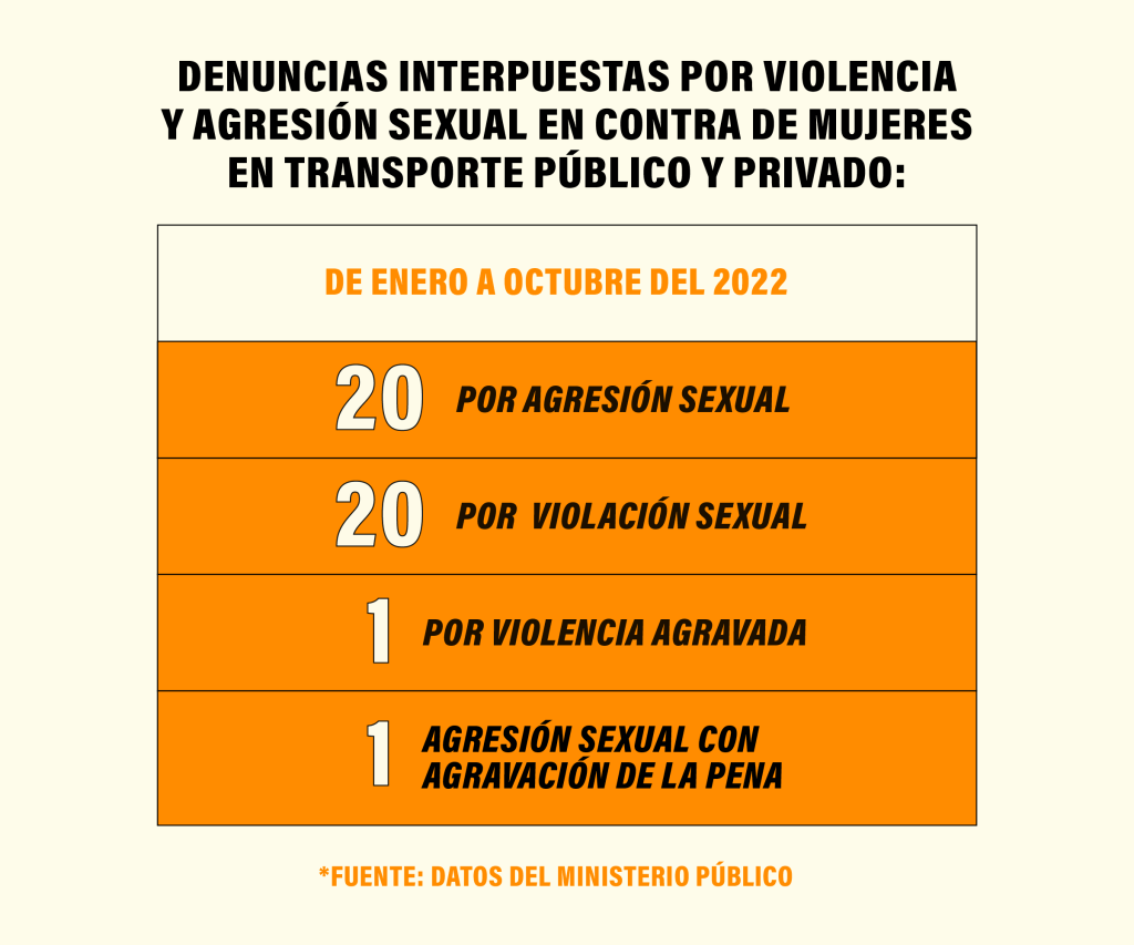 En el transcurso del 2021, el MP recibió 60 denuncias por delitos cometidos contra mujeres en medios de transporte tales como buses, transurbanos, transmetros, Uber, InDrive y taxis.
