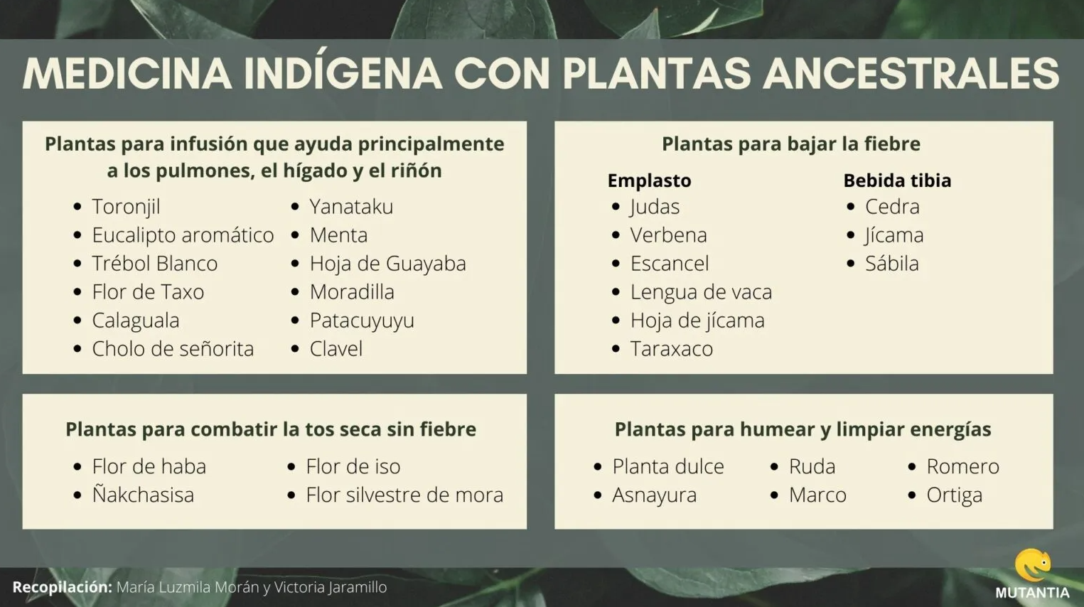 Sus métodos se basan en hierbas medicinales, metales coloidales, masajes y ventosas, pero sobre todo en un acompañamiento físico, emocional y espiritual. Al igual que la medicina tradicional china o la ayurveda, para la medicina ancestral indígena, la salud es algo integral y sus tratamientos se aplican a varios síntomas. “Cuando nosotros hablamos de enfermedades no hablamos netamente de un síntoma, sino de lo que está sucediendo en nuestro entorno, en nuestra hermandad cósmica, lo que nosotros llamamos el ayllu”, dice Avelina Rogel. “Solo así podemos comprender lo que pasa en el cuerpo de cada uno”.