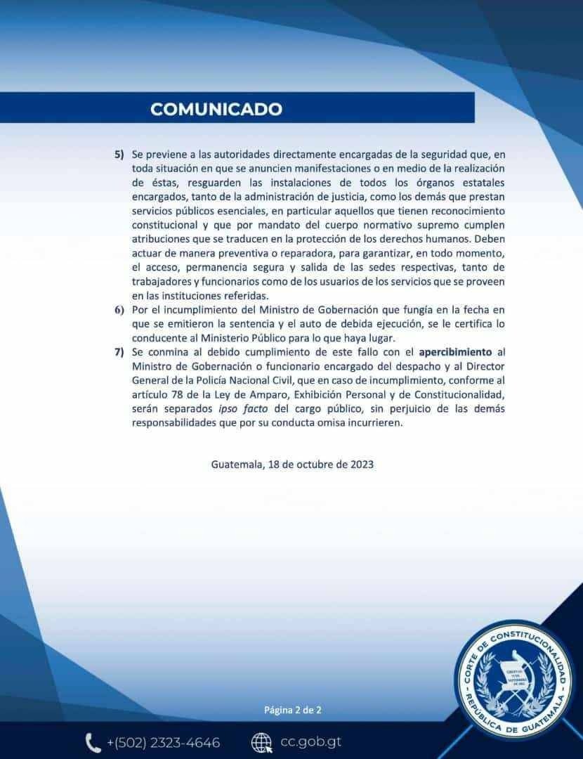 En una decisión de alto impacto, la Corte de Constitucionalidad otorgó ayer un plazo de 6 horas a las fuerzas de seguridad para proceder con el desalojo de los manifestantes en la sede central del Ministerio Público, en el barrio Gerona, zona 1 capitalina. Esto sucedió en un contexto tenso desde el día martes, con la renuncia de David Napoleón Barrientos, ministro de gobernación.