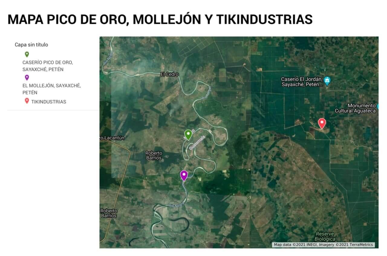 Pico de Oro es, en realidad, una isla en la tierra. Está limitada al oeste por el río Salinas, como se llama ahí la porción del caudal que viene de la presa Chixoy, en Alta Verapaz, que luego se convierte en el Usumacinta y está rodeado por los demás flancos, por 520 hectáreas de palma de aceite, propiedad de Tikindustrias, que cultiva del lado de Guatemala desde hace 17 años.
