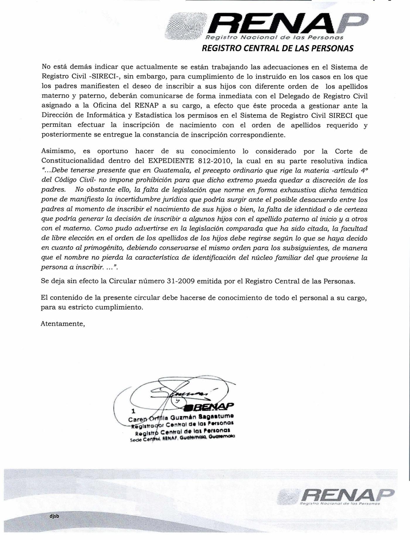 En la nueva circular 015-2021 del RENAP se puede leer que durante el proceso de registro de nuevos nacimientos, “en el caso que comparezcan ambos padres, casados o no, deberá consignarse al hijo/a un apellido de cada uno de ellos, en el orden expresado por ellos”, respetando el principio de igualdad de derechos que tienen hombres y mujeres para decidir el orden de los apellidos.