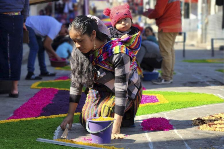 Con niños en brazos, niños devotos y toda la familia, así se involucran en la acostumbrada realización de las alfombras, esto con motivo de la mañana de vía crucis que recorrerá las principales calles del municipio de Comitancillo San Marcos, a unos 248 kilómetros de la ciudad de Guatemala.