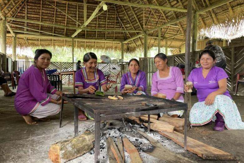 Foto principal: Miembros de Sani Warmi comparten chicha y alimentos tradicionales alrededor de la brasa. Foto: Ana Cristina Alvarado