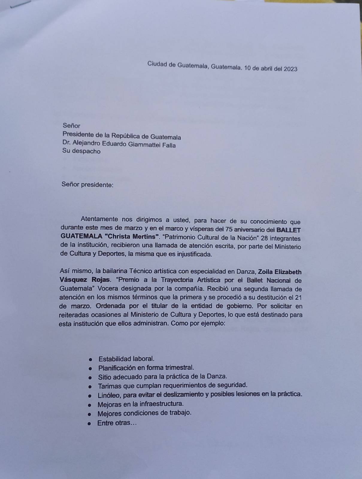 Una carta dirigida al presidente de la República Alejandro Giammattei fue entregada en la Secretaría Privada de la Presidencia, el documento cuenta con más de 500 firmas, que solicitan la reinstalación de la bailarina Zoila Elizabeth Vásquez Rojas de Argueta. A la bailarina la acompañaron Alcides Argueta, Director Musical del Ballet Moderno y Folklórico, Rossana Ananda licenciada en Arte y Josué Carillo, pianista del Ballet Nacional de Guatemala.