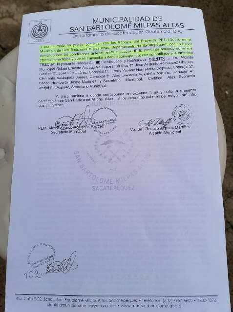 Según dijo, la municipalidad de Santa Lucía Milpas Altas, le notificó tres veces a la empresa que no podían realizar trabajos en el municipio. El año pasado, durante el estado de calamidad, la empresa no detuvo sus trabajos.