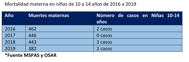 Este fenómeno, que tiene sus causas principales en la violencia sexual y en las uniones tempranas tiene un impacto negativo en el desarrollo de las niñas. En Guatemala, establecer relaciones sexuales con una persona menor de 14 años constituye un delito de violación, según el artículo 173 de la Ley contra la Violencia Sexual, Explotación y Trata de Personas, aprobado en el 2009.