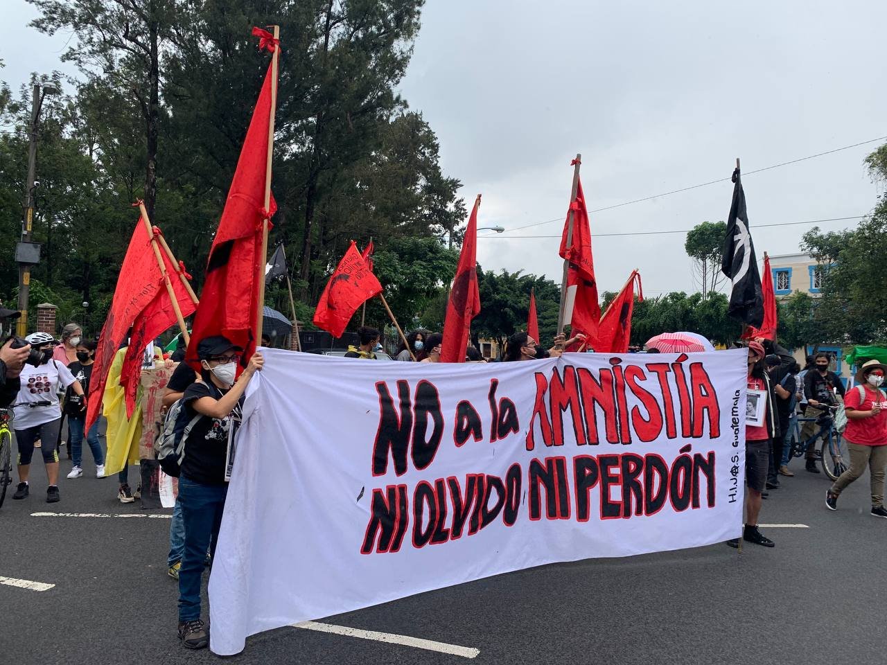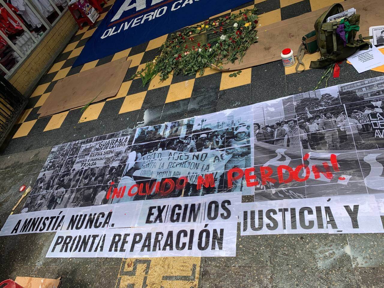 La marcha inició con tres mantas, en las cuales se leían los mensajes “No a la amnistía. Ni olvido ni perdón”, “Caerán genocidas, volverá la primavera”. La primera estación fue frente a la Casa de la Memoria y la sede del Centro para la Acción Legal en Derechos Humanos -CALDH-. En esta les esperaba una acción conmemorativa con un árbol que enseñaba los rostros de personas desaparecidas durante la guerra.