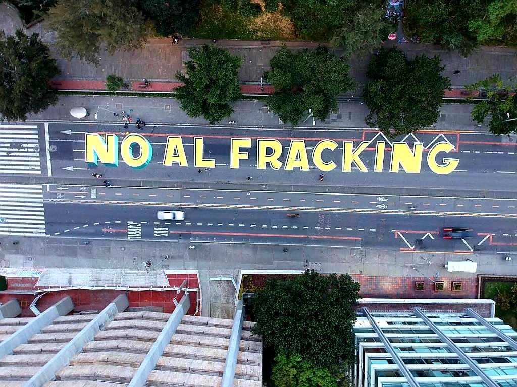 Uno de los mensajes que se pintaron en la tradicional carrera séptima de Bogotá en el Día del Medio Ambiente en 2021. Foto: cortesía Alianza Colombia Libre de Fracking