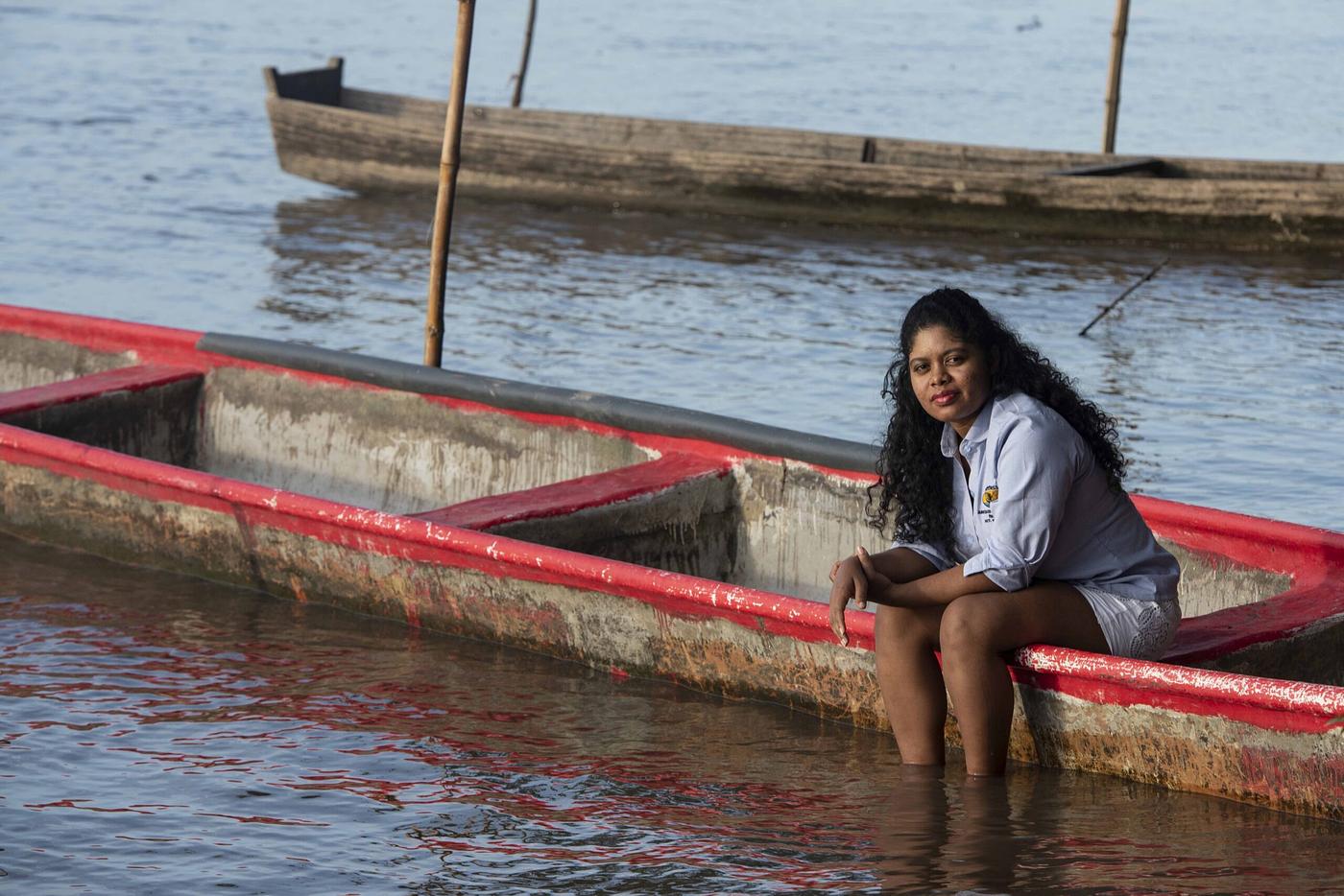 Yuvelis Morales Blanco, sentada en un bote sobre el río Magdalena, frente a su casa. Foto: cortesía Christian Escobar Mora